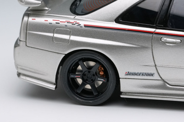 ホイールはオートサロン出展時とは異なり、6本スポークの「NISMO LM GT-MAG」の試作品が装着されています。モデルでは真鍮切削原型をホワイトメタルの鋳造部品に置き換えたものにブラックの塗装を施し、ロゴ類のデカールを貼って仕上げています。
