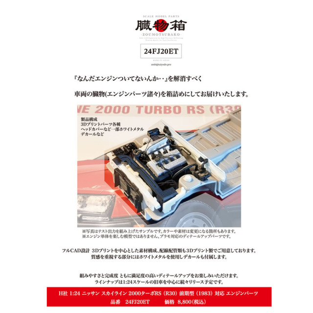 | 製品名: | 臓物箱 24FJ20ET 1/24 ニッサン スカイライン 2000ターボRS (R30) 前期型 (1983) 対応エンジンパーツセット |
