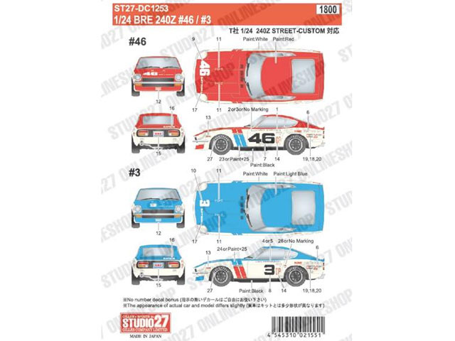 TOP Decal(デカール)STUDIO271/24 scale Large Scale Kit(1/24-1/8キット)STUDIO27Decal STUDIO27デカール DC1253 1/24 BRE 240Z #46 /#3 (for Tamiya) 【メール便可】 価格: ¥1,980 (税込) 販売期間: メーカー: Studio27 数量: 個 在庫 2個 スタジオ27社のデカールです。 商品説明 スタジオ27デカール 商品仕様 製品名: DC1253 1/24 BRE 240Z #46 /#3 (タミヤ対応) メーカー: Studio27